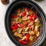 A flavorful slow cooker recipe for Salt & Pepper Sticky Chicken with tender chicken breast cooked in a savory blend of soy sauce, ginger, and spices, finished with crunchy red peppers and spring onions. Perfect served with rice or noodles for an easy weeknight meal.