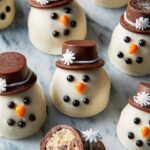 - Assemble Hats: Dip the smaller end of each Rolo candy into the remaining ganache, then attach it to the flat side of an Oreo half to form the snowman’s hat. If using, dip snowflake sprinkles into ganache and affix them where the Oreo meets the Rolo.