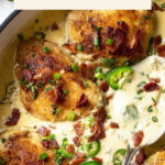 Jalapeño Popper Chicken is a flavorful, creamy, and spicy skillet dish featuring seared chicken breasts smothered in a rich sauce made with cream cheese, sour cream, cheddar, and diced jalapeños, topped with crispy bacon and green onions. Perfect for a comforting dinner with a kick.