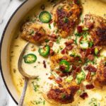 Jalapeño Popper Chicken is a flavorful, creamy, and spicy skillet dish featuring seared chicken breasts smothered in a rich sauce made with cream cheese, sour cream, cheddar, and diced jalapeños, topped with crispy bacon and green onions. Perfect for a comforting dinner with a kick.