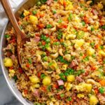 Delicious pineapple fried rice combining sweet pineapple chunks, savory ham, colorful vegetables, and perfectly seasoned rice for a quick and flavorful meal.