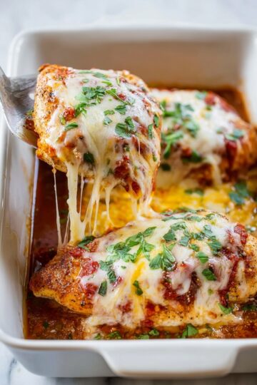 Take the chicken out and sprinkle 1 cup of shredded cheese evenly over the top. Switch your oven to broil on high and slide the dish under the broiler for 1-2 minutes, just until the cheese melts and bubbles beautifully. Keep a close eye here — you want it perfectly gooey, not burnt.