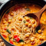 This Thai Red Curry Soup is a flavorful and creamy dish featuring a blend of red curry paste, coconut milk, and fresh vegetables, combined with chickpeas and rice noodles for a satisfying meal. Perfectly balanced with a hint of lime and garnished with cilantro, this soup is both comforting and vibrant.