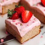 This easy fresh strawberry sheet cake recipe features a moist and fluffy strawberry-infused cake topped with a silky cream cheese frosting enhanced with strawberry jam. Perfect for summer gatherings or any occasion, this cake combines fresh or thawed strawberries with a simple batter and is baked to perfection in a 9x13 inch pan. Decorate with fresh strawberries for a beautiful and delicious treat.