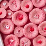 Celebrate Valentine’s Day with these delightful Cookie Cups featuring a soft, chewy sugar cookie base filled with a sweet Hershey’s Hug center and topped with decorative sprinkles. Perfect bite-sized treats to share and enjoy!