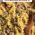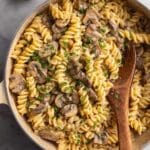 This Vegan Mushroom Stroganoff recipe is a creamy, savory dish featuring tender mushrooms and al dente rotini pasta in a rich vegan beef broth sauce, enhanced with white wine, thyme, and nutritional yeast for depth of flavor. Perfectly dairy-free and comforting, it’s a delicious plant-based twist on a classic stroganoff.