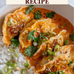 - Garnish and serve: Sprinkle your choice of garnishes such as sesame seeds, green onions, cilantro, or chili crisp oil. Serve the dumpling bake hot over a bed of white jasmine rice or noodles and enjoy.