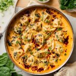 Delicious and easy Dumpling Bake featuring frozen veggie dumplings simmered in a rich red curry coconut broth with fresh vegetables, baked to bubbly perfection for a flavorful one-pan meal.