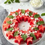 - Add Stars and Feta: Place the watermelon stars on top of the wreath arrangement and sprinkle the crumbled Greek feta cheese evenly over the salad.